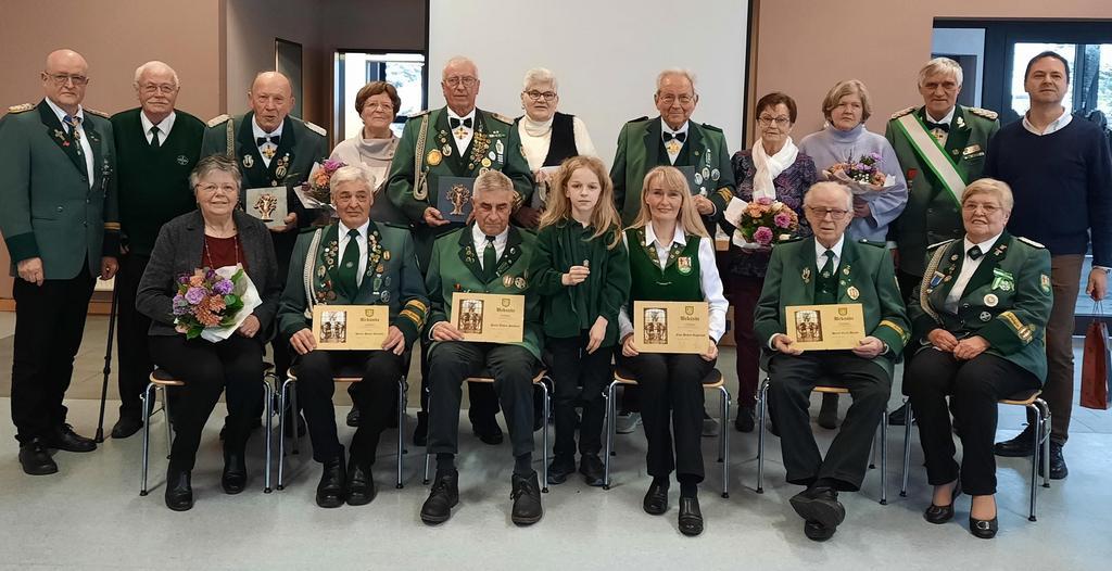 Am Sonntag 22.01.23 fand der Familientag der Kelberger Schützen statt. Ein Vortrag von Jürgen Schäfer beleuchtete die Geschichte der Bruderschaft vor dem Hintergrund der allgemeinen geschichtlichen Entwicklung. Passend zu der Reflexion der letzten Jahrzehnte, besonders auch des sozialen u. gesellschaftlichen Engagements der Bruderschaft, wurden einige Ehrungen vorgenommen. Brudermeisterin Marga Kinner und der Bezirksbundesmeister Norbert Steffens begannen mit Vinzenz Theisen u. Erich Bouhs. Beide stehen seit 65 Jahren im Dienst der Schützen. Heinz Theisen wurde für 60 und Walter Steffens für 50 Jahre geehrt. Ursula Hagerhoff ist seit 40 Jahren Mitglied. Marga Kinner kann auf 25 Jahre zurückblicken. Tobias Theisen 15 Jahre und Sebastian Theisen 10 Jahre. Als ganz besonderes Dankeschön erhielten, als „Dienstälteste“ Schützen, Heinrich Braun, Josef Zimmer u. Vinzenz Theisen eine Schiefertafel mit dem Bildnis des Hl. Sebastianus in Bronze.