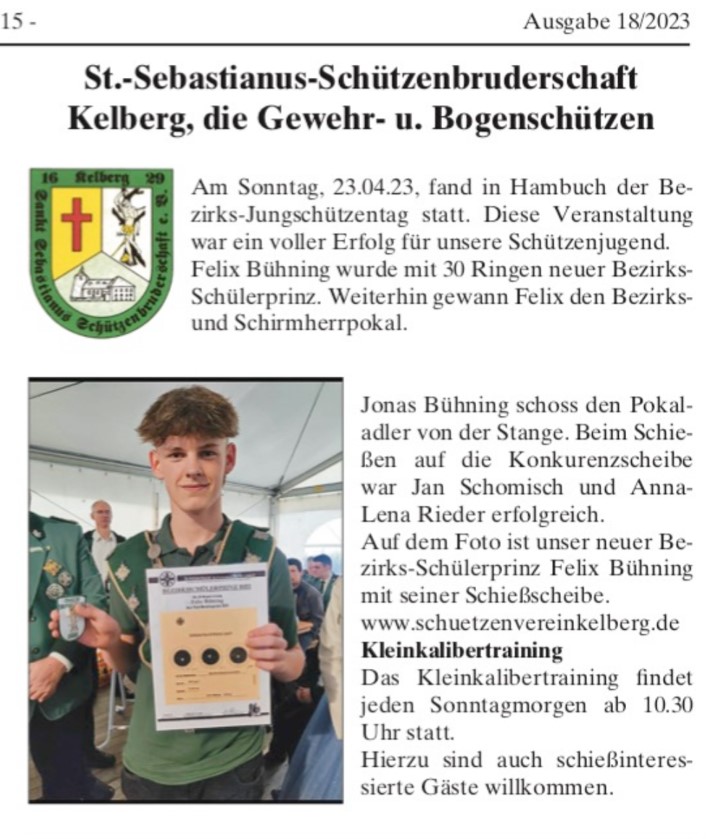 Damit wird Finya die Schützenbruderschaft Kelberg beim Bezirksschülerprinzenschießen im Jahr 2024 vertreten. Hier hätte Felix ohnehin nicht mehr antreten können, da er im nächsten Jahr zu den Jungschützen wechselt.