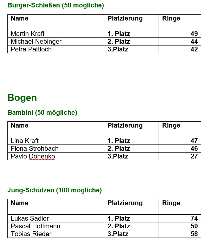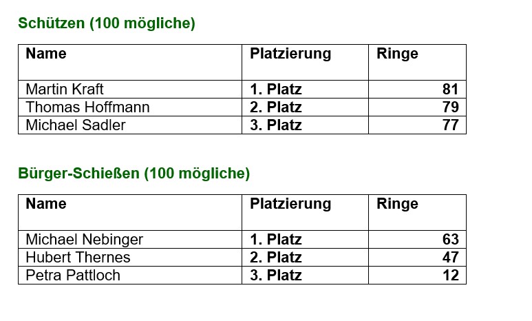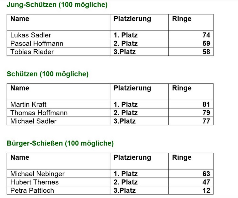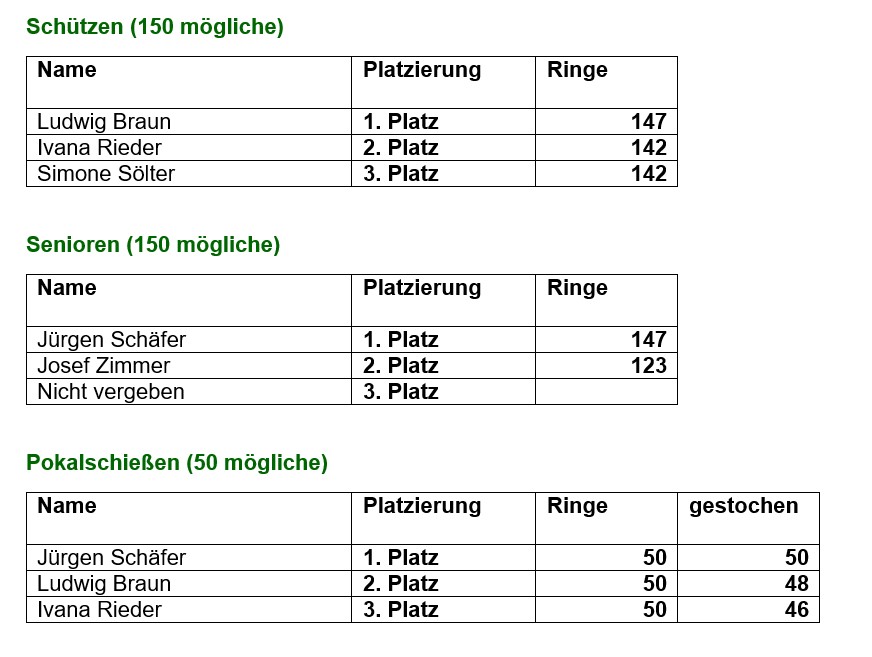 Wegen der Vielzahl der Disziplinen, die geschossen wurden, werden hier nur die Erstplatzierten genannt. Die weiteren Ergebnisse sind unter www.schuetzenvereinkelberg.de zu finden.