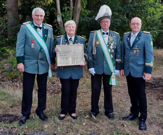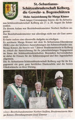 Er hatte zudem eine ehrenvolle Aufgabe zu erledigen: Er zeichnete Marga Kinner mit dem St.-Sebastianus-Ehrenkreuz (SEK) eine der höchsten Auszeichnungen des Schützenbundes aus.